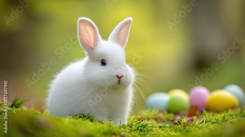 Obraz premium Adorable White Rabbit Amongst Colorful Eggs, Perfect for Easter-Themed Projects and Springtime Celebrations