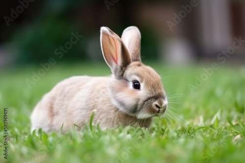 Fototapeta premium Adorable white rabbit on a green grass. Easter concept. Generative AI