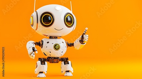 © Muhammad, Obraz premium Adorable White Robot with Big Eyes and Smiling Face Pointing Upward, Solid Soft Orange Background for Tech-Themed Visuals