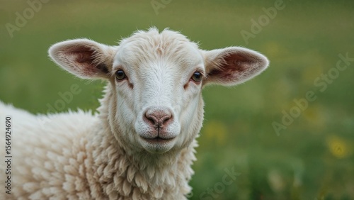 © Artem, Obraz premium Adorable white sheep in lush green pasture