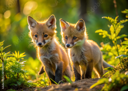 © Sirinporn, Naklejka premium Adorable wild baby red foxes frolic and chase each other through sun-dappled underbrush, their bushy tails and curious gazes capturing pure forest innocence.