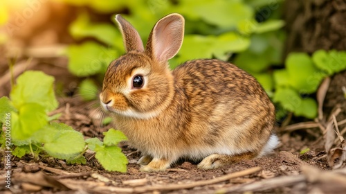Fototapeta premium Adorable Wild Rabbit in Lush Green Foliage
