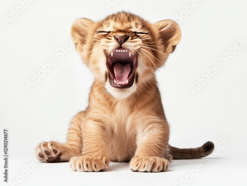 © Riz, Obraz premium Adorable Yawning Lion Cub on White Background
