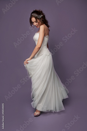 © different_nata, Fototapeta premium Adorable young bride with brown curly hair and pearl headpiece