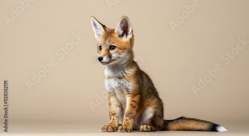 © gn8, Obraz premium Adorable young fox with fluffy ears sitting on neutral background for wildlife conservation design