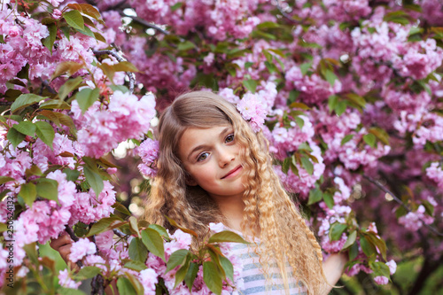 Fototapeta premium Adorable young girl with curly hair in pink dress walking in blossom cherry...