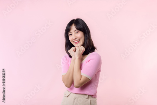 © Jirawatfoto, Fototapeta premium Adorable young happy asian woman model with shy emotion smiling expression cheerful positive attractive face and holding hand isolated on pink pastel studio background. Portrait beautiful cute lady.