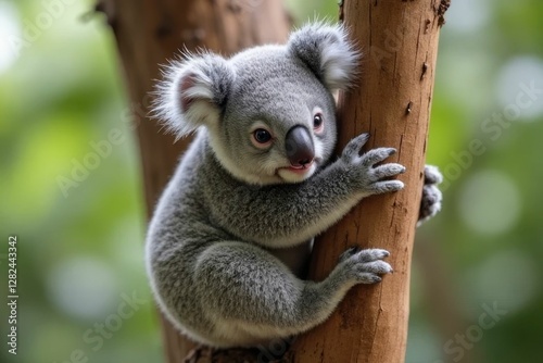Naklejka premium Adorable Young Koala Climbing a Tree in Natural Habitat Surrounded by Lush...