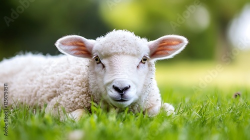 Obraz premium Adorable Young Lamb Laying on Fresh Grass in Sunlit Farm Environment :...