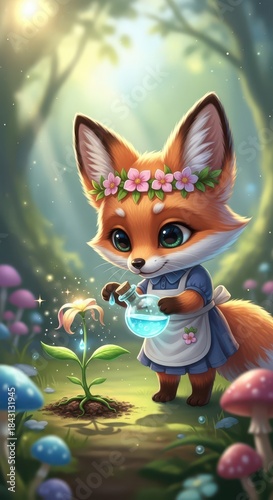 Obraz premium Adorable young mammal wearing a floral crown nurtures a glowing plant with a potion in a magical woodland setting