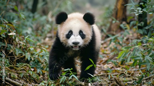 Fototapeta premium Adorable Young Panda Cub Exploring Bamboo Forest in Nature