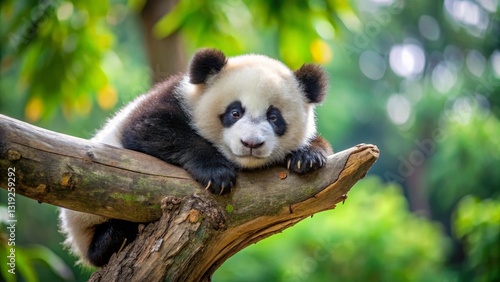 © sunton, Obraz premium Adorable Young Panda Resting on a Tree Branch in a Lush Green Forest
