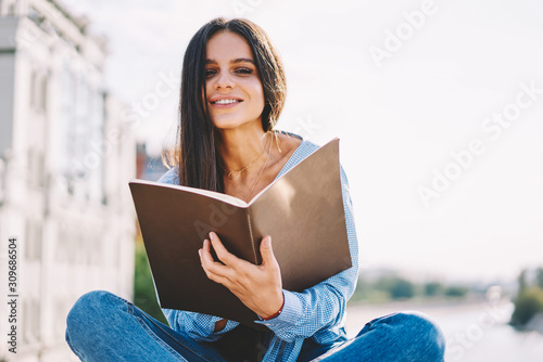 Obraz premium Adorable young student girl with brunette hair sitting and studying outdoors on bright summer day, portrait of attractive woman holding notebook doing homework looking at camera enjoying sunny weather