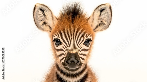 © amorn_m, Obraz premium Adorable Zebra Foal Portrait with Brown Markings Against a Clean White Background