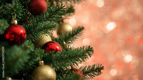 © Natsumae, Obraz premium Adorned Evergreen A Holiday Tree Sparkling with Festive Red and Gold Ornaments, a Timeless Scene.
