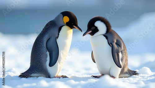 © 09, Fototapeta premium Adult and Baby Penguin Standing Together in Snow