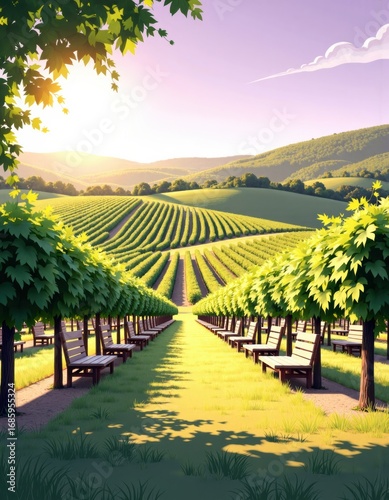 © Aliaksandr Barouski, Fototapeta premium Adult and child enjoying a vineyard seating area near lush grape fields
