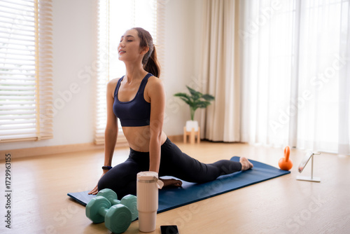Fototapeta premium Adult Asian woman practices yoga stretching for wellness at home peaceful...