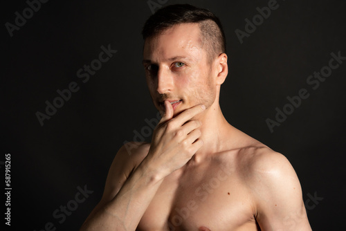 Fototapeta premium Adult attractive man with a beautiful body posing in the studio. Black background.
