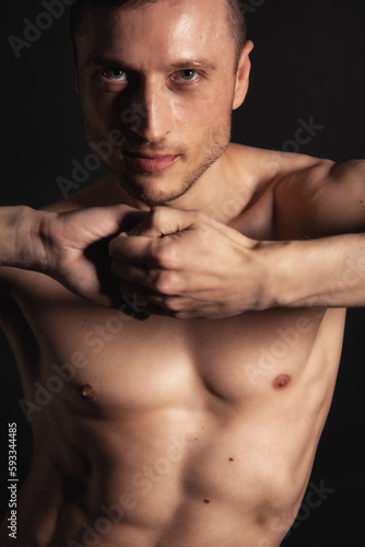 Fototapeta premium Adult attractive man with a beautiful body posing in the studio. Black background.