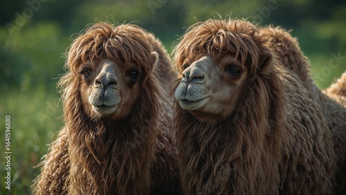 Obraz premium Adult Bactrian camels in a green meadow, critically endangered species...