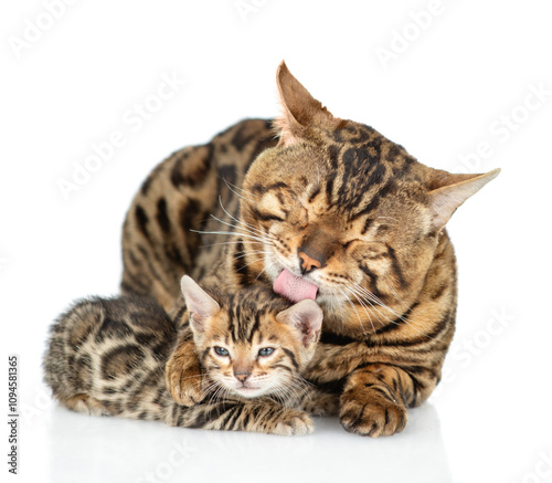 Obraz premium Adult bengal cat hugs and licks tiny kitten. isolated on white background