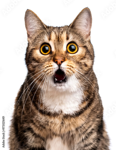 © Saddha Visual, Obraz premium Adult cat with funny expression, surprised or shocked and open mouth looking at camera isolated on white background