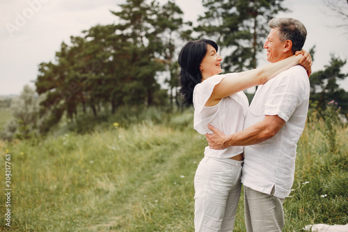 © hetmanstock2, Fototapeta premium Adult couple in a summer field. Handsome senior in a white shirt. Woman in a white blouse