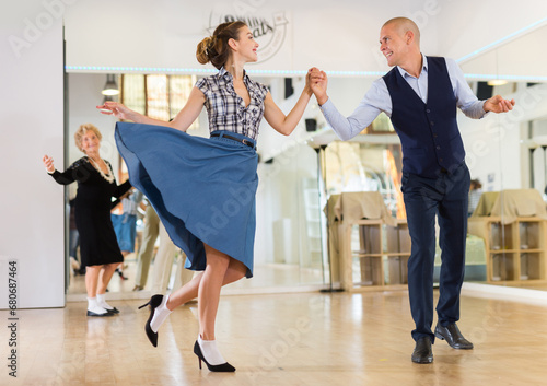 © caftor, Fototapeta premium Adult dancing couple enjoying active swing