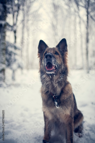 © lichtflut_photo, Naklejka premium Adult german shepherd standing in the snow with a snowy face. Dog on a walk in winter