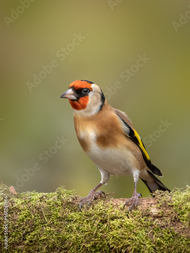 Obraz premium Adult Goldfinch, Carduelis carduelis, perched on mossy branch - Essex, UK, October 2021