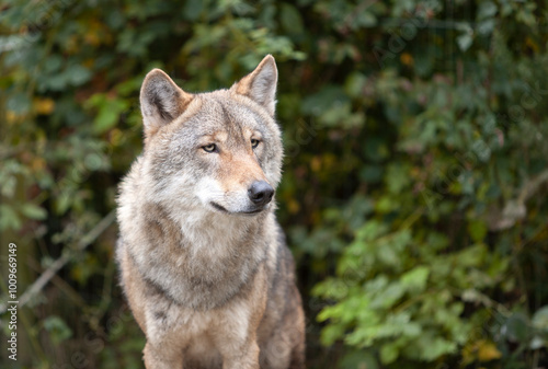© Eleonora, Fototapeta premium Adult Grey Wolf Canis Lupus in the autumn forest natural habitat environment, Wild Ireland