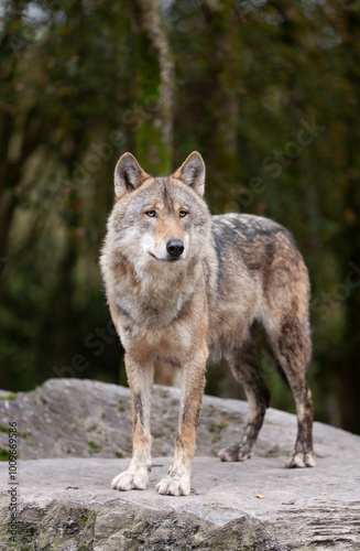 © Eleonora, Fototapeta premium Adult Grey Wolf Canis Lupus in the autumn forest natural habitat environment, Wild Ireland