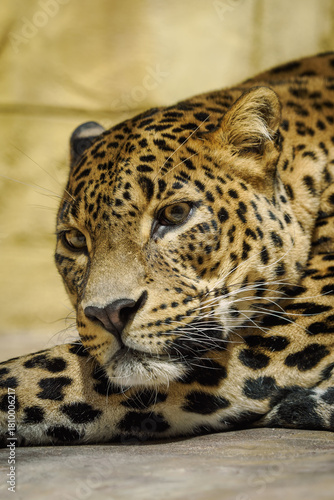 Obraz premium Adult leopard predator kept in captivity indoors.