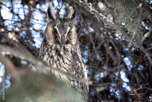 Obraz premium Adult Long-eared owl perched on a fir tree branch