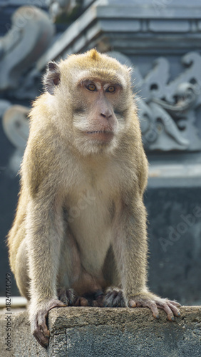 Naklejka premium Adult macaque seated on temple stone against detailed relief Nusa Penida...