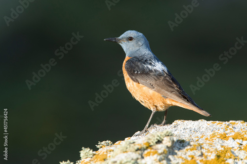 Naklejka premium Adult male of Rufous-tailed rock thrush with the first light of dawn in its breeding territory