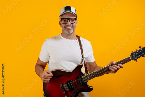 Obraz premium Adult man with his red electric guitar.