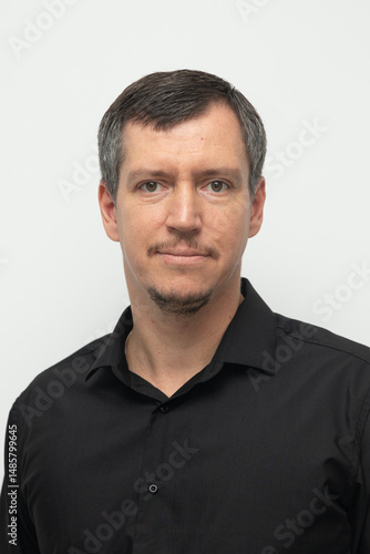 © Светлана Назарова, Fototapeta premium Adult man with mustache in black shirt on white background