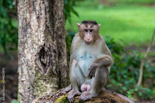 Naklejka premium Adult monkeys sits and eating tree leaf in the forest showing emotions to other monkey Sanjay Gandhi National Park Mumbai Maharashtra India.