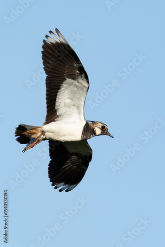Obraz premium Adult Northern Lapwing (Vanellus vanellus) in flight against the blue sky