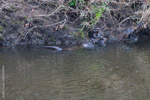 Fototapeta premium Adult Otter swimming in a river, County Durham, England.