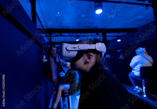 © Jakub Rutkiewicz, Fototapeta premium Adult parent with children using virtual reality headsets in sensory environment.