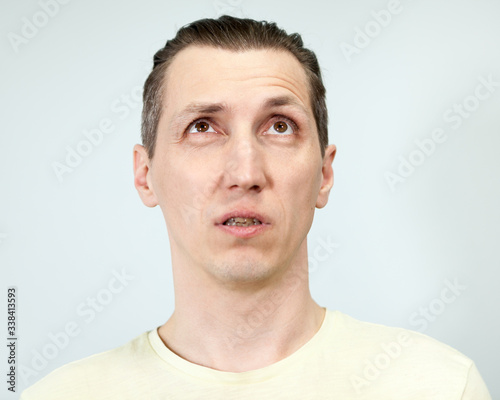 Obraz premium Adult person remembers something, looking up, opened mouth, portrait on grey...