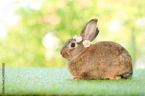 Fototapeta premium Adult rabbit sits on green graas in nature bokeh as background. Lovely mature bunny wears flower wreath on its head. Cute pet photo.