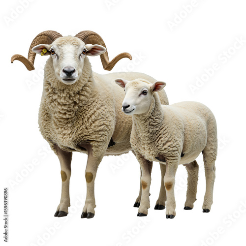 © Katerina Polibina, Fototapeta premium Adult ram and young lamb standing together on white background, isolated