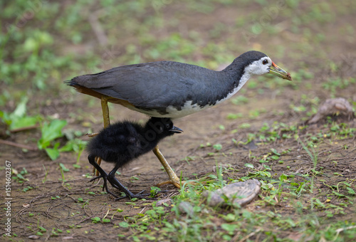 Naklejka premium Adult White-breasted Waterhen Protectively Sheltering Young Chick on Ground