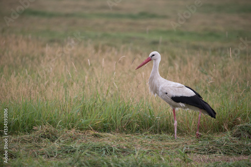 Fototapeta premium adult white stork (ciconia ciconia) searching for food on mowed meadow