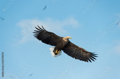 © Uryadnikov Sergey, Obraz premium Adult White-tailed eagle in flight. Blue sky background. Scientific name: Haliaeetus albicilla, also known as the ern, erne, gray eagle, Eurasian sea eagle and white-tailed sea-eagle.
