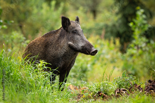 © WildMedia, Fototapeta premium Adult wild boar, sus scrofa, with wet fur standing alone in the green forest. Attentive swine observing fresh woodland. Concentrated hog with big snout in its natural habitat with copy space.